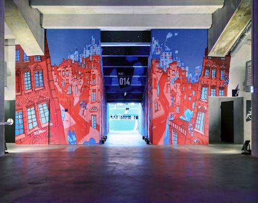 Sì, c'è una galleria d'arte all'interno di uno stadio. La Offside Gallery presenta grandi murales di artisti di strada dipinti sulle pareti dello stadio.